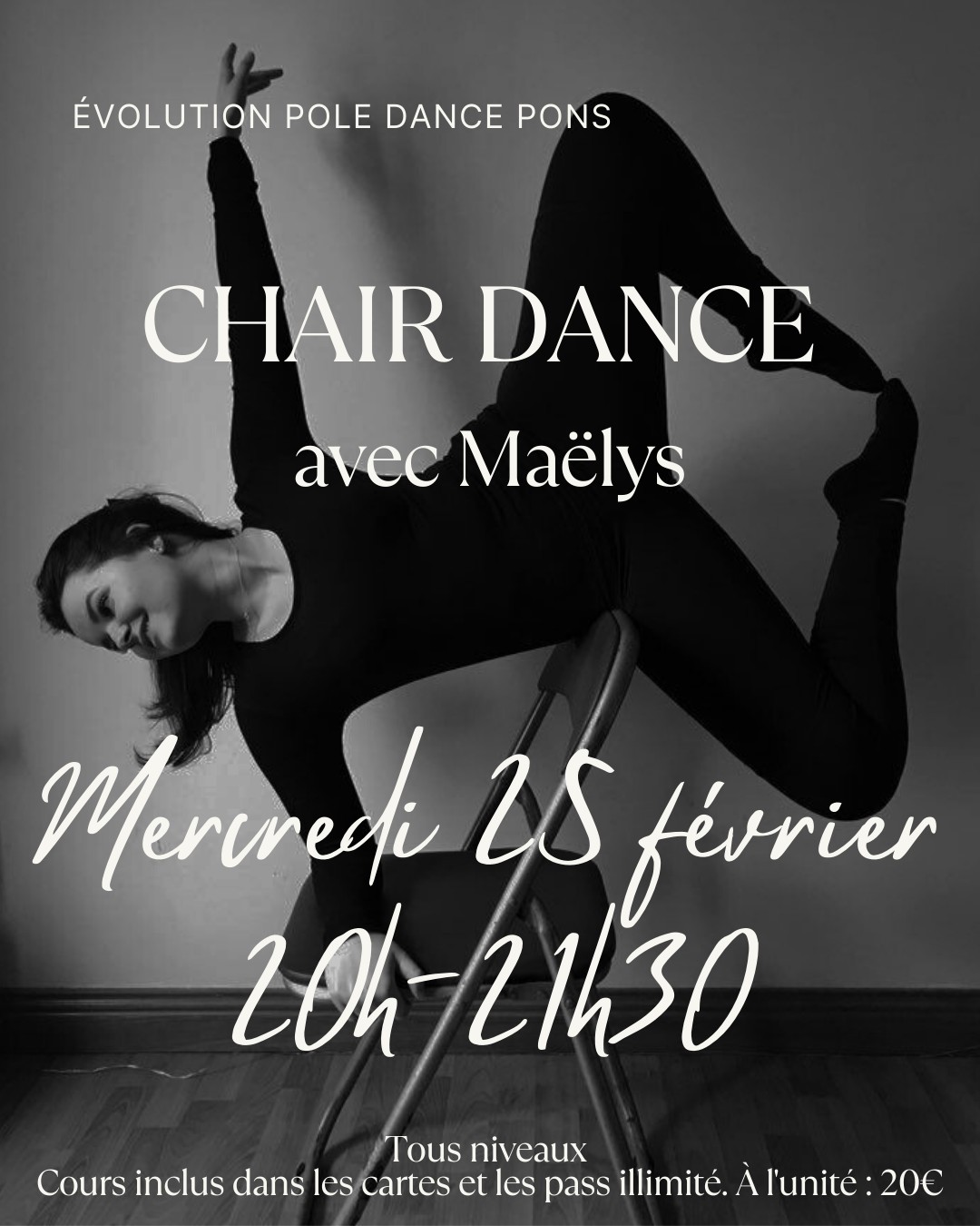 La chaise devient un véritable partenaire où on y travaille : la fluidité, la musicalité, et le lacher prise au travers d'une chorégraphie accessible et progressive.