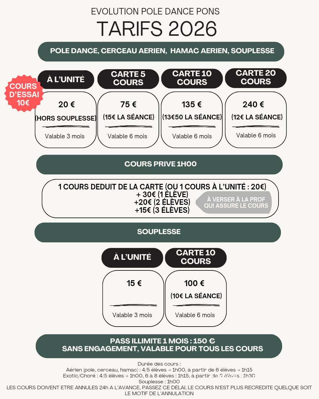 Règlements au studio par : CHÈQUE à l'ordre de EVOLUTION POLE DANCE ou ESPÈCES.